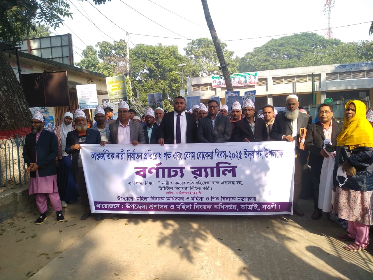 "নারী ও কন্যার প্রতি সহিংসতা বন্ধে ঐক্যবদ্ধ হই, ডিজিটাল নিরাপত্তা নিশ্চিত করি" এই প্রতিপাদ্যকে সামনে রেখে নওগাঁর আত্রাইয়ে আন্তর্জাতিক নারী নির্যাতন প্রতিরোধ পক্ষ এবং বেগম রোকেয়া দিবস-২০২৫ উপলক্ষে বর্ণাঢ্য র্যালী ও আলোচনা সভা অনুষ্ঠিত হয়েছে।