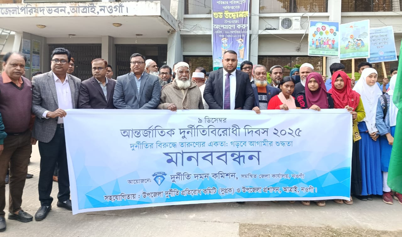 'দুর্নীতির বিরুদ্ধে তারুণ্যর একতা, গড়বে আগামীর শুদ্ধতা' এই প্রতিপাদ্যকে সামনে রেখে নওগাঁর আত্রাইয়ে আন্তর্জাতিক দুর্নীতিবিরোধী দিবস-২০২৫ উদযাপন করা হয়েছে। দুর্নীতি দমন কমিশন সমন্বিত নওগাঁ জেলা কার্যালয়ের আয়োজনে এবং উপজেলা দুর্নীতি প্রতিরোধ কমিটি ও উপজেলা প্রশাসনের যৌথ সহযোগিতায় এ উপলক্ষে আলোচনা সভা অনুষ্ঠিত হয়েছে।