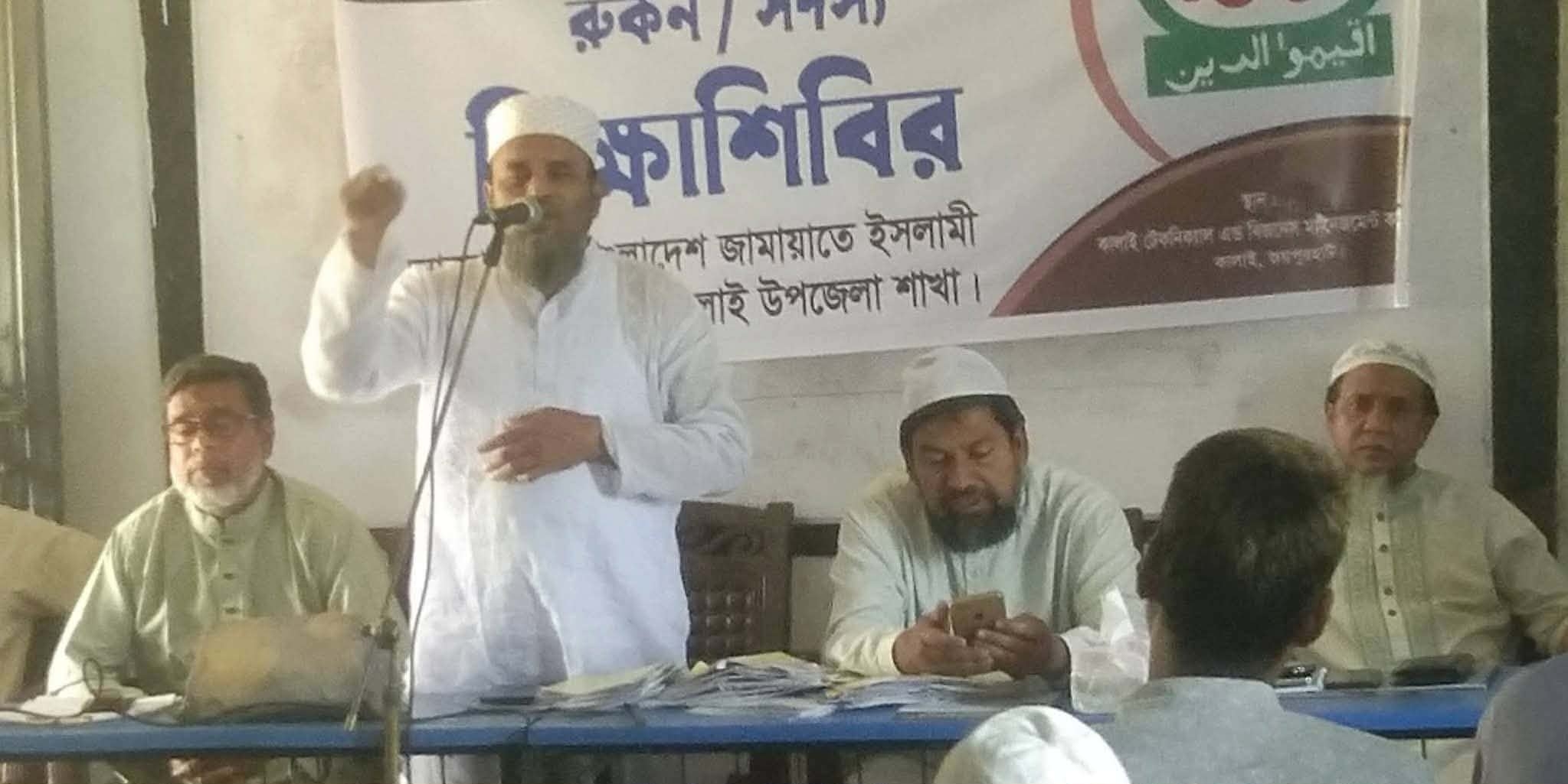 বাংলাদেশ জামায়াতে ইসলামী জয়পুরহাট জেলার কালাই উপজেলা শাখার আয়োজনে সদস্য শিক্ষা শিবির ১১ এপ্রিল শনিবার- ২০২৬ সকাল ৯টায় কালাই টেকনিক্যাল এন্ড বিএম কলেজ অডিটোরিয়ামে উপজেলা আমীর মাওঃ মুনছুর রহমানের সভাপতিত্বে শিক্ষা শিবিরে পবিত্র কোরআন থেকে দার্স পেশ করেন জেলা তারবিয়াত সেক্রেটারি মাওঃ মোঃ মাহমুদুল হাসান। বাৎসরিক পরিকল্পনা নিয়ে গ্রুপ আলোচনা করেন অধ্যক্ষ মোঃ তাইফুল ইসলাম, আব্দুর রউফ, আব্দুল আলীম, মোজাফ্ফর হোসেন, মোঃ খাইরুল ইসলাম, আনোয়ারুল হক। রুকুনিয়াতের আসল চেতনার উপর আলোচনা করেন জেলা সহকারি সেক্রেটারি এস এম রাশেদুল আলম। আনুগত্য,পরামর্শ, এহতেশাব বিষয়ের উপর আলোচনা করেন জেলা জামায়াতের সেক্রেটারি গোলাম কিবরিয়া। বাইয়্যাতের আলোকে আমাদের জীবনের গুরুত্বরোপ করে বক্তব্য রাখেন জয়পুরহাট জেলা জামায়াতের আমীর ও জয়পুরহাট-১ আসনের সংসদ সদস্য মোঃ ফজলুর রহমান সাঈদ। বিকেলে মাননীয় এমপি সাহেব দলীয় নেতৃবৃন্দকে সাথে নিয়ে কালাই পৌরসভা এলাকায় জনসাধারণের মাঝে লিফলেট বিতরন করেন।
