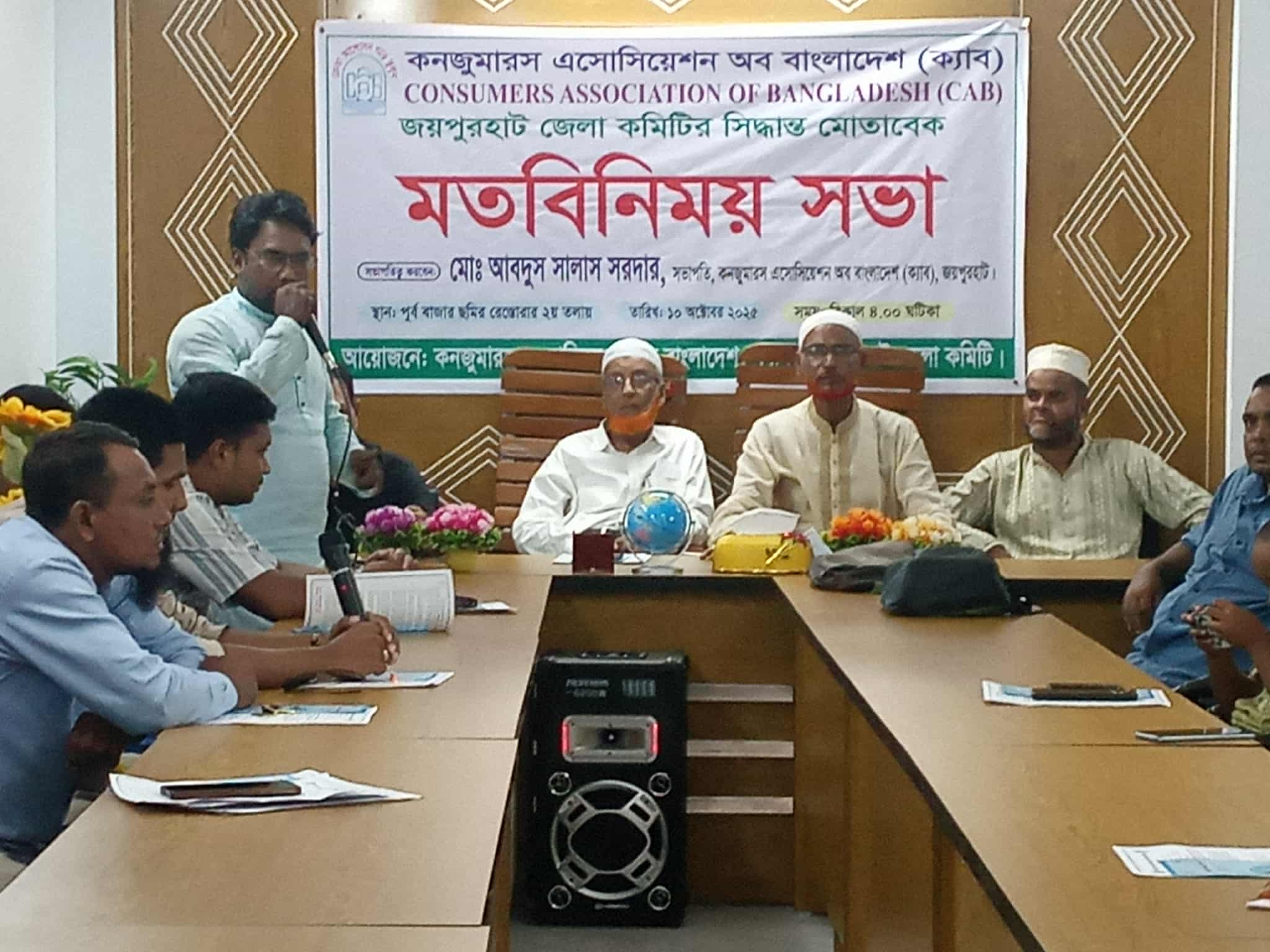 ভোক্তা অধিকার সংরক্ষণে সচেতনতা বাড়াতে জয়পুরহাটে কনজুমারস অ্যাসোসিয়েশন অব বাংলাদেশ (ক্যাব) জেলা কমিটির উদ্যোগে এক মতবিনিময় সভা অনুষ্ঠিত হয়েছে। শুক্রবার বিকেলে জয়পুরহাট পৌর শহরের পূর্ব বাজারের ছমির রেস্তোরাঁর কনফারেন্স রুমে এই সভা হয়।