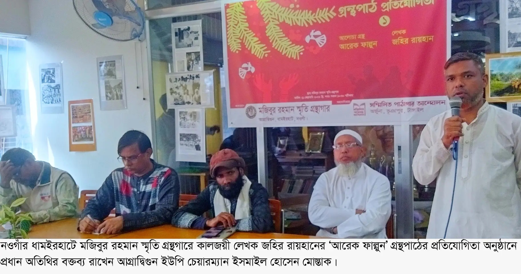 নওগাঁর ধামইরহাটে কালজয়ী লেখক জহির রায়হানের ‘আরেক ফাল্গুন’ গ্রন্থপাঠ প্রতিযোগিতা অনুষ্ঠিত হয়েছে। ২১ ফেব্রুয়ারী বেলা ১১ টায় আগ্রাদ্বিগুন বাজারে অবস্থিত মজিবুর রহমান স্মৃতি গ্রন্থগারে এস.এম খেলাল ই রব্বানীর সভাপতিত্বে ‘আরেক ফাল্গুন’ গ্রন্থের পাঠ প্রতিযোগিতায় অংশ নেন বিভিন্ন স্কুল কলেজের ৩০ জন শিক্ষার্থী। ভাষা আন্দোলনে কারাবরণকারী জহির রায়হানের অবদান, তার জীবন ইতিহাস ও বাংলা ভাষা নিয়ে আবৃতি ও গ্রন্থপাঠে বিজয়ীদের সনদ ও পুরস্কৃত করেন অনুষ্ঠানের প্রধান অতিথি আগ্রাদ্বিগুন ইউপি চেয়ারম্যান ইসমাইল হোসেন মোস্তাক।