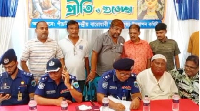 এসময় জেলা পুলিশ সুপার মোহাম্মদ আব্দুল ওয়াহাব, সহকারী পুলিশ সুপার (পাঁচবিবি সার্কেল) মোঃ তুহিন রেজা, থানার তদন্ত ওসি মোঃ ইমায়েদুল জাহিদী, পুলিশের বিশেষ শাখার ডিআইও-১ মোঃ মিজানুর রহমান, জেলা পুলিশের গোয়েন্দা শাখা (ডিবি) ওসি মোঃ আসাদুজ্জামান, পাঁচবিবি উপজেলা বাংলাদেশ হিন্দু বৌদ্ধ খ্রিষ্টান ঐক্য পরিষদের সাধারণ সম্পাদক সুভাষ চন্দ্র দাস, উপজেলা পুজা উদযাপন কমিটির সাধারণ সম্পাদক জীবনকৃষ্ণ সরকার বাপ্পী, বারোয়ারী মন্দির পুজা উদযাপন কমিটির সভাপতি দুলু গোয়ালা, পাঁচবিবি বণিক সমিতির সাবেক সভাপতি ভরত প্রসাদ গোয়ালা ও পাঁচবিবি প্রেসক্লাবের সম্পাদক সজল কুমার দাস সহ অনেকেই।