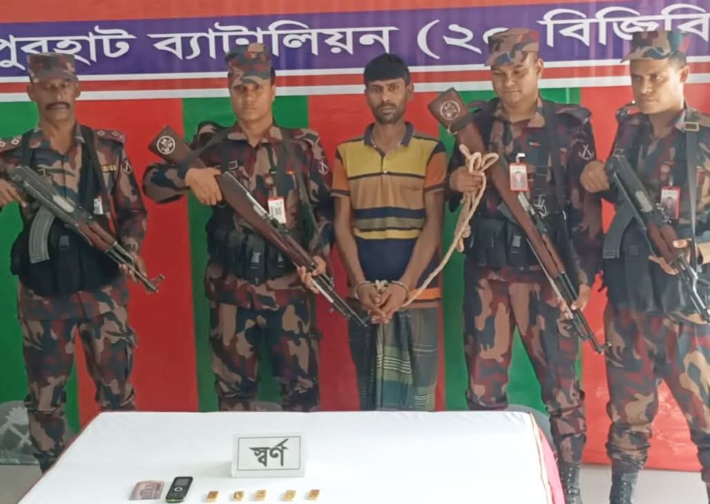 জয়পুরহাটের পাঁচবিবি সীমান্তে ৫'টি স্বর্নের বার সহ পাচারকারীকে আটক করেছে বর্ডার গার্ড বাংলাদেশ বিজিবি।