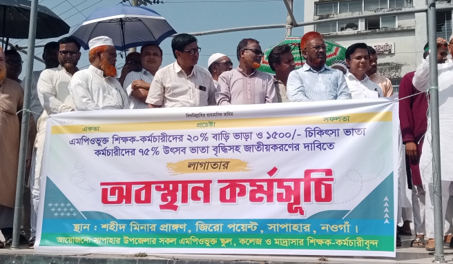 নওগাঁর সাপাহারে ৩ দফা দাবীতে এমপিওভুক্ত শিক্ষক কর্মচারীদের লাগাতার অবস্থান কর্মসূচি অনুষ্ঠিত হয়েছে।
