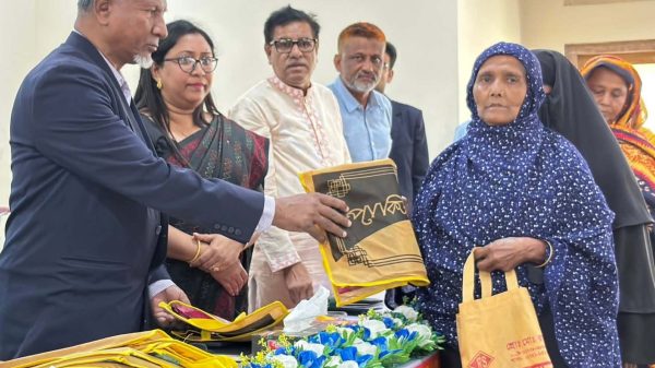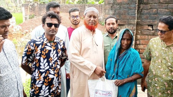 সাপাহারে প্রধানমন্ত্রীর ত্রান তহবিলের নগদ অর্থ শাড়ি থ্রি-পিস ও হাজী রুমাল বিতরণ